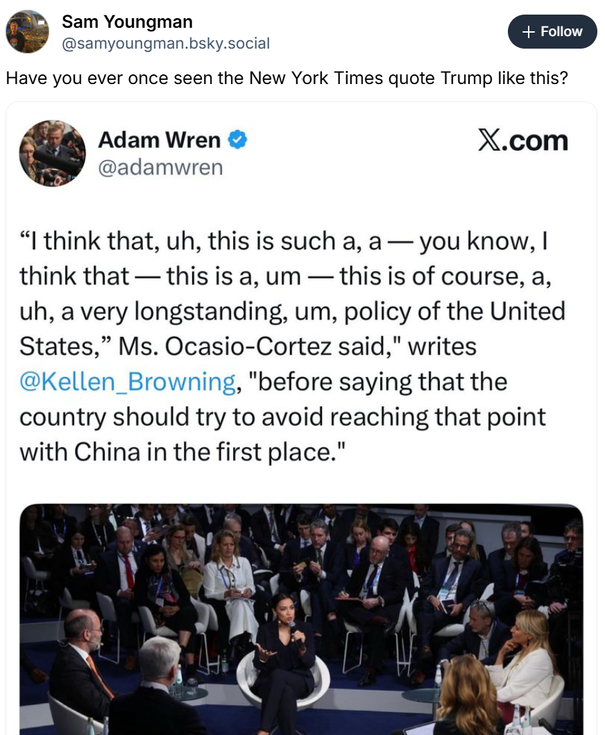 The New York Times, like most mainstream outlets, routinely goes comically out of its way to try and normalize President Donald Trump's verbal incontinence. But when it comes to a progressive challenger to establishment norms, you'll notice they're suddenly very careful to transcribe and accentuate every verbal misstep: